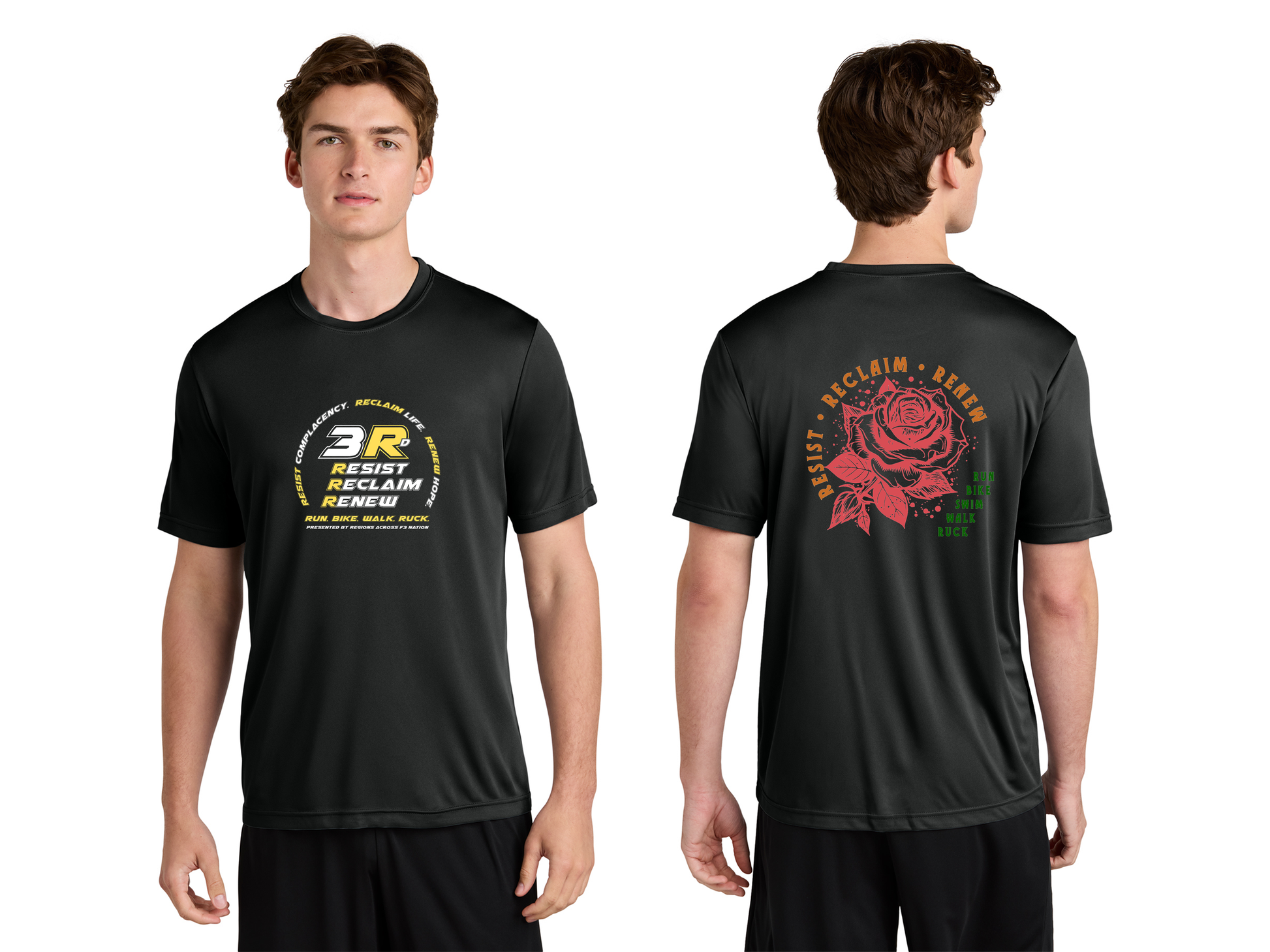 Back Logo: F3 Midlands Rose logo in red, orange and green ink