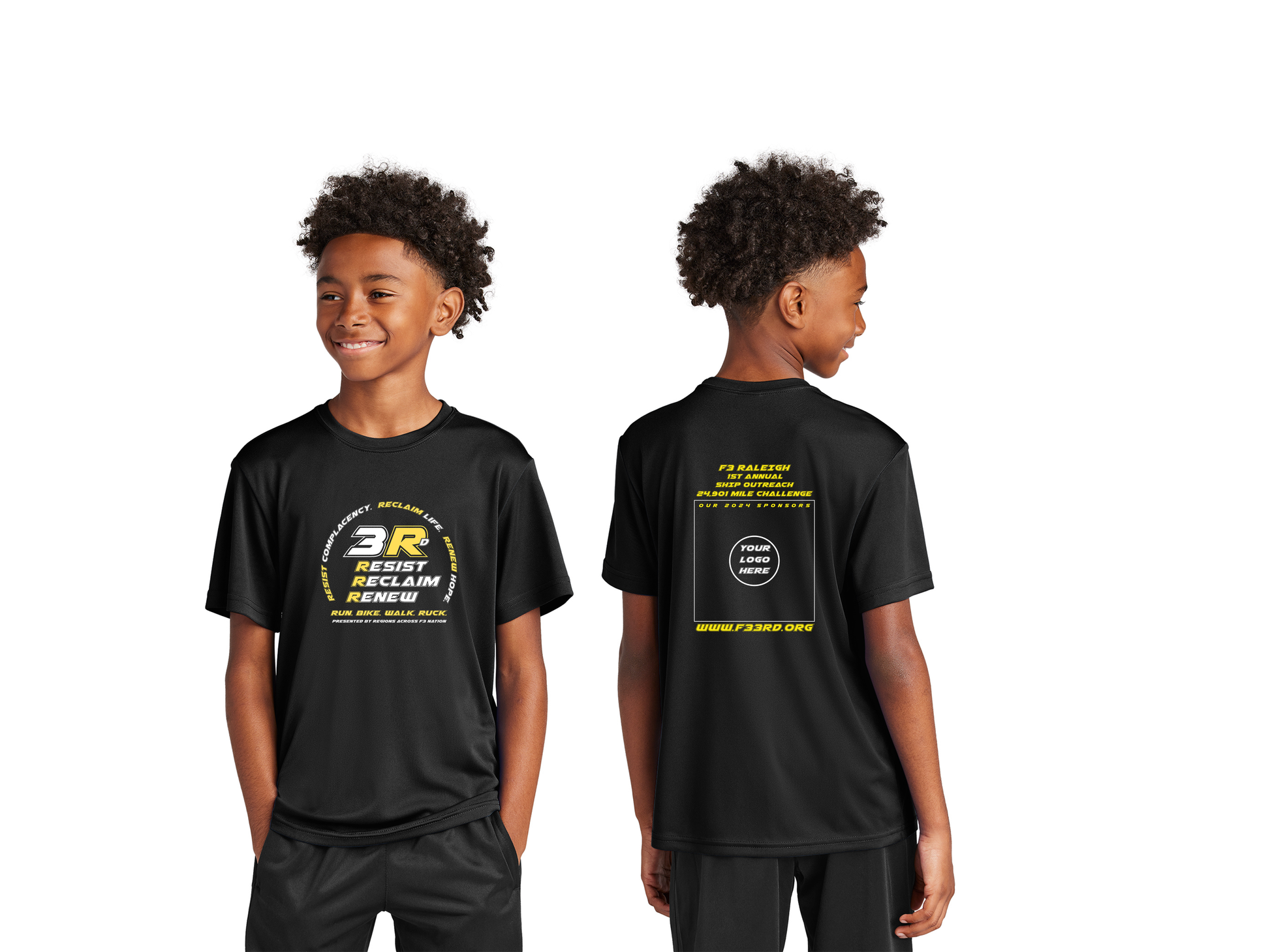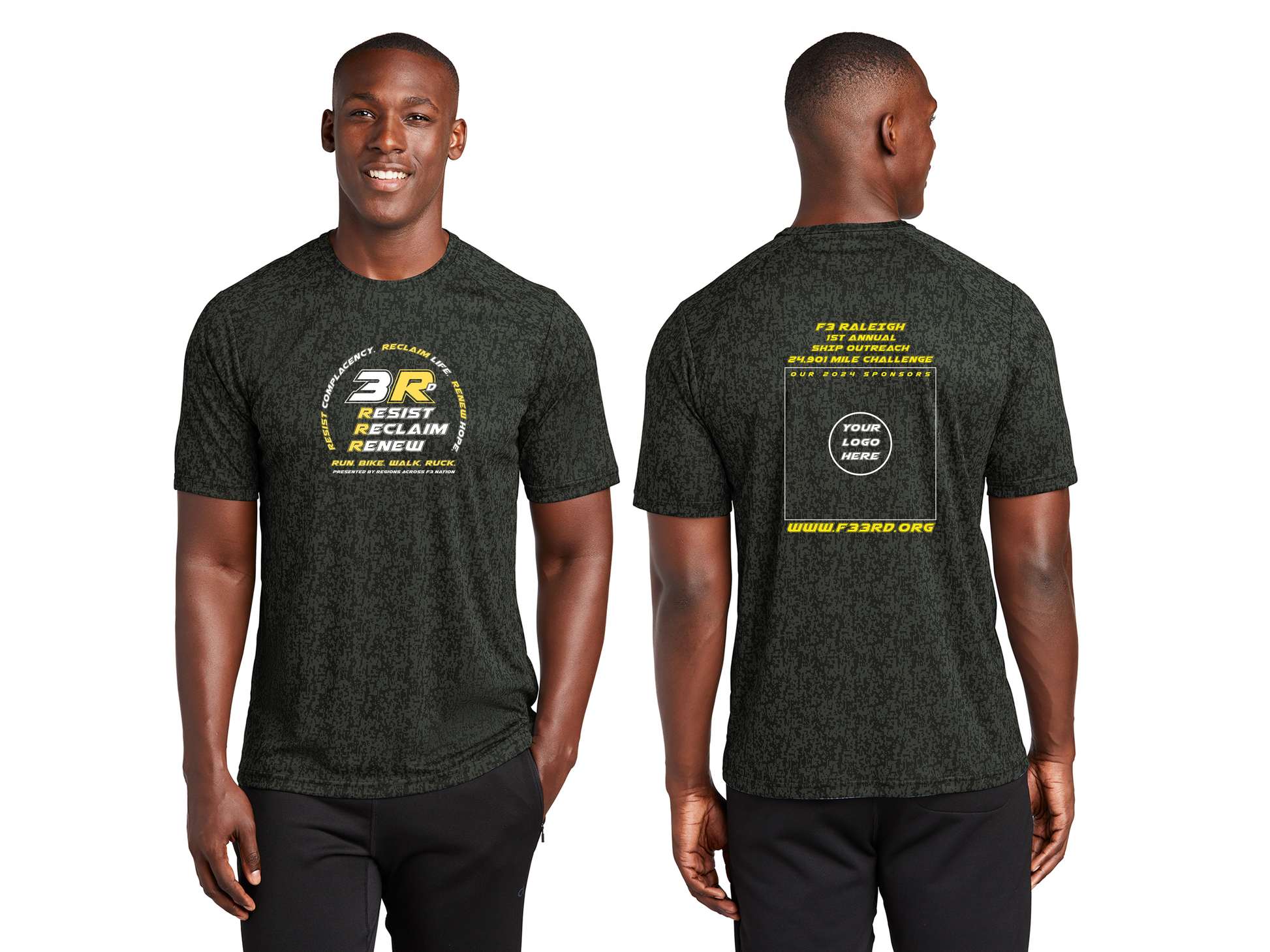 Back Logo: F3 Raleigh + Ship Outreach 1st Annual Event Sponsors in white and athletic gold ink