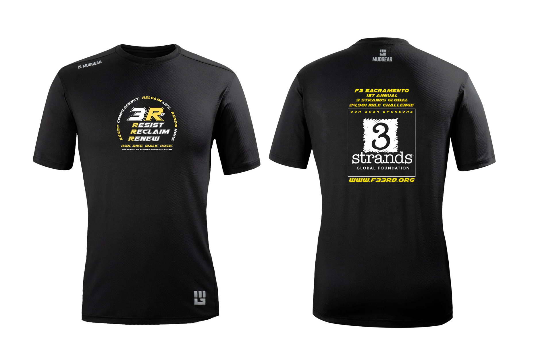 Back Logo: F3 Sacramento + Charity 1st Annual Event logo in white and athletic gold ink