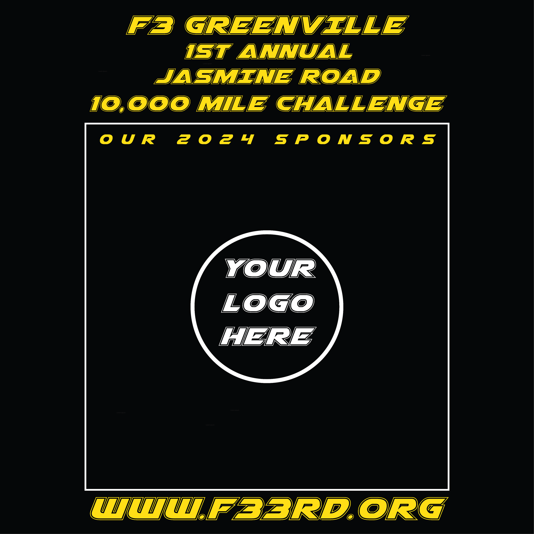 Back Logo: F3 Greenville + Jasmine Road 1st Annual Mileage Challenge Sponsors in white and athletic gold ink
