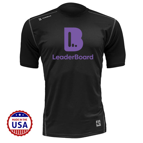 Front Logo: LeaderBoard Logo in purple screen print on center chest